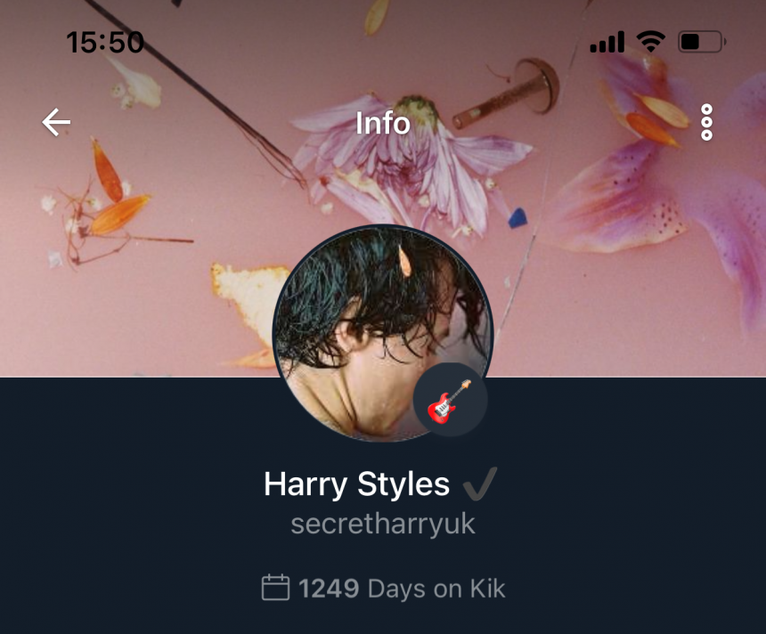 xoxharrystylesxoxx | Impersonating Harry Styles on Kik. Asking for explicit pictures and videos. Have in mind, the real H... | Kik Scam |