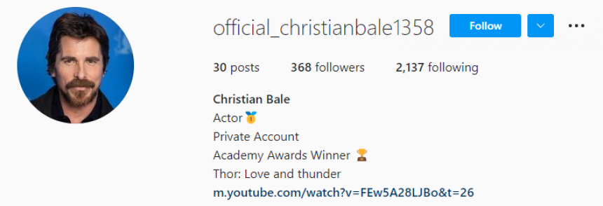 official_christianbale1358 | official_christianbale1358 is an impersonator of Christian Bale on Instagram, deceitfully asking for... | Instagram Scam |