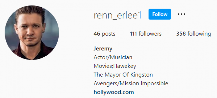 renn_erlee1 | renn_erlee1 is a phony account claiming to be Jeremy Renner, involved in money scams. | Instagram Scam |