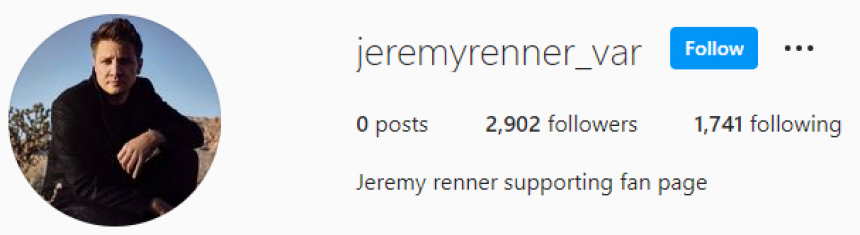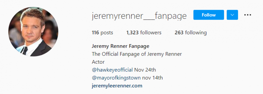 jeremyrenner___fanpage | jeremyrenner___fanpage is a fake Jeremy Renner account posing as a "Fan Page" to lure and scam users... | Instagram Scam |