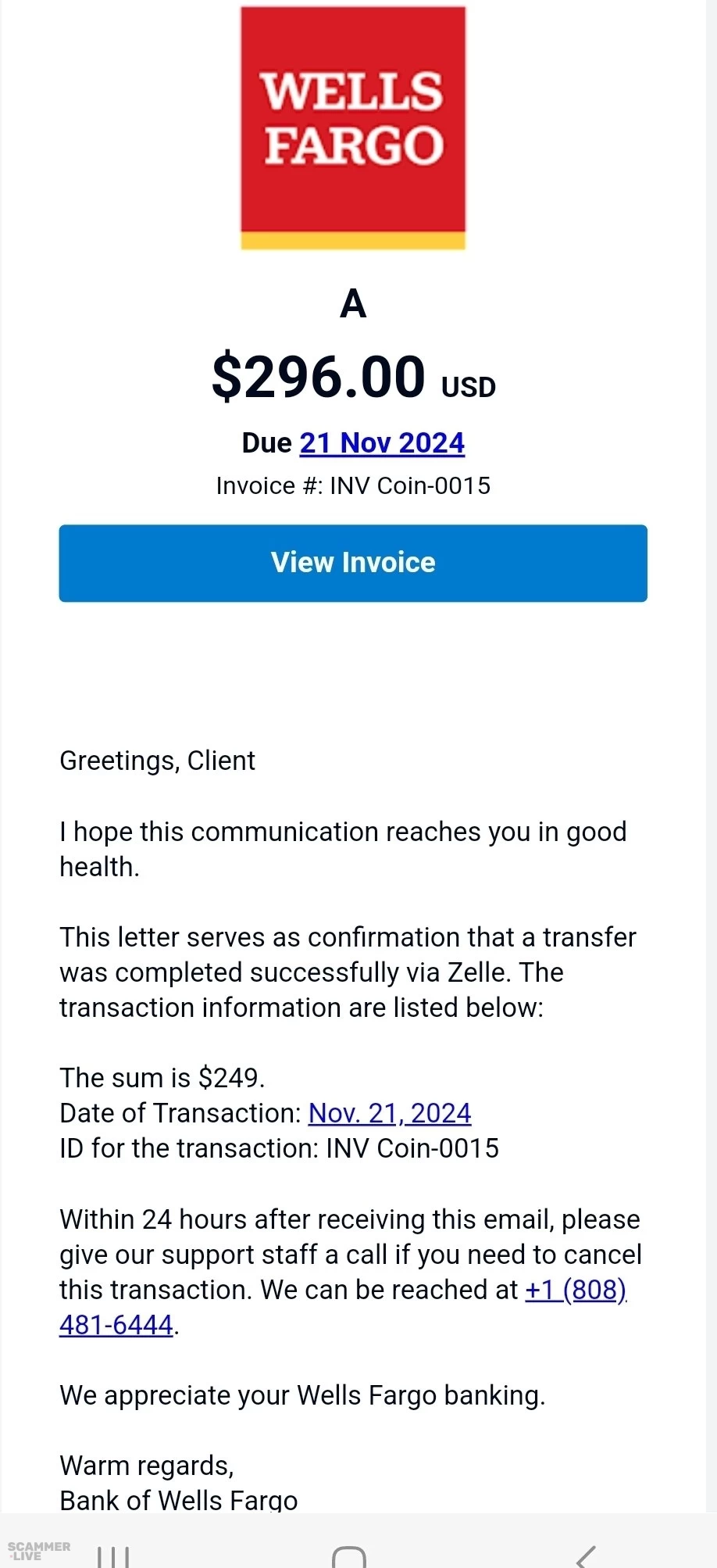 +1 (808) 481-6444 Wells Fargo scam regarding a transfer via Zelle | $296.00 Due 21 Nov 2024 Invoice INV Coin-OOI 5 View Invoice Greetings, Client I hope this commu... | Banking Scam |