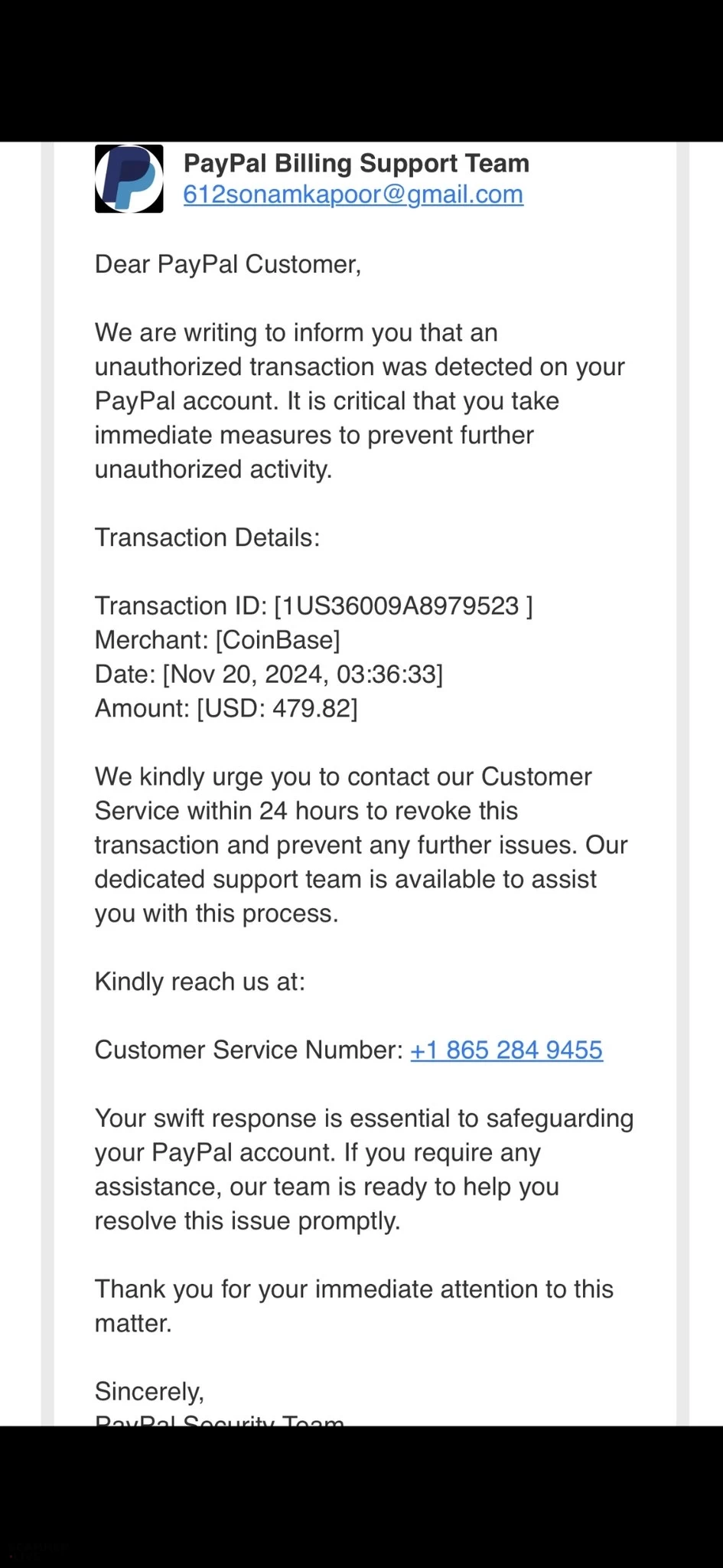 612sonamkapoor@gmail.com, +1 865 284 9455 PayPal scam regarding coinbase transaction | PayPal Billing Support Team 612sonamkapoor@gmail.com Dear PayPal Customer, We are writing to info... | PayPal Scam |