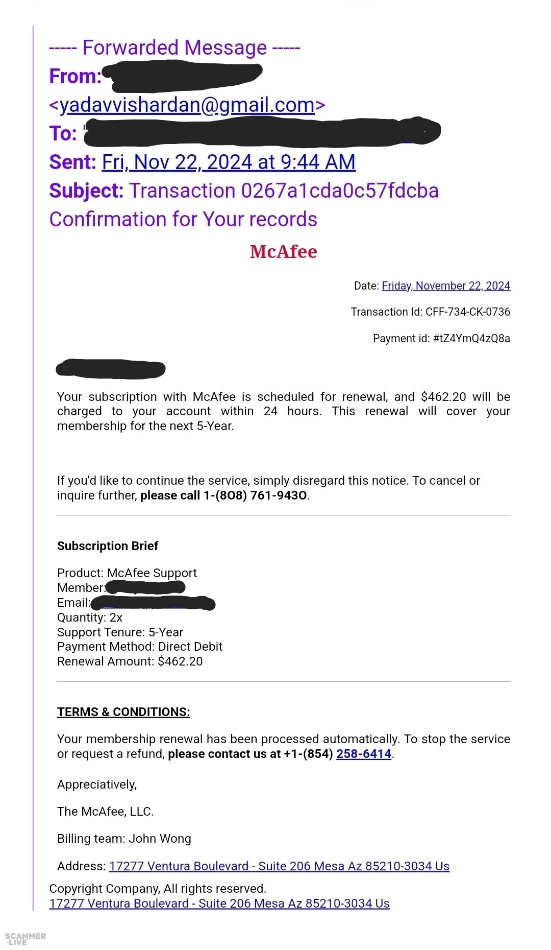 (854) 258-6414, (808) 761-9430 McAfee scam regarding McAfee Support renewal | — Forwarded Message — From: <yadavvishardan@gmail.com> sent: Subject: Transaction 0267a1 cda0c57... | McAfee Scam |