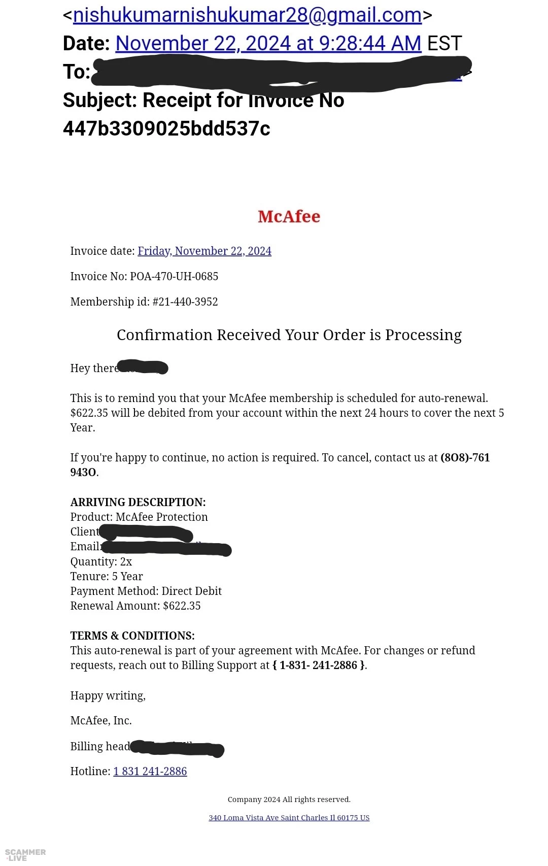 831 241-2886, nishukumarnishukumar28@gmail.com McAfee scam regarding Protection plan renewal | nishukumarnishukumar28@gmail.com Date: November 22, 2024 at AM EST To: Subject: Receipt for Invoi... | McAfee Scam |