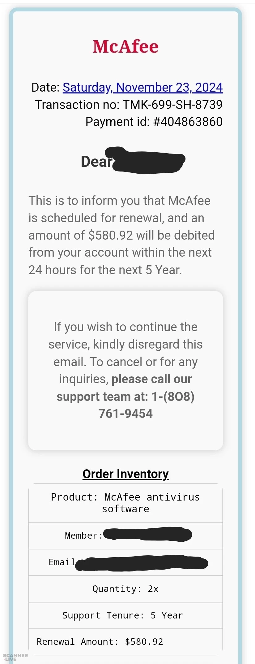 (808) 761-9454 McAfee scam regarding renewal of McAfee Antivirus Software for 5 years | Date: Saturday, November 23, 2024 Transaction no: TMK-699-SH-8739 Payment id: #404863860 Dear Th... | McAfee Scam |