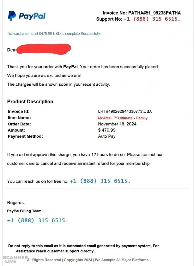 +1 (888) 315-6515 PayPal scam regarding McAfee Ultimate Family subscription | PayPal Invoice No: PATHA#51 99238PATHA •+1 (888) 315 6515. Support No. Transaction amount $479 9... | PayPal Scam |