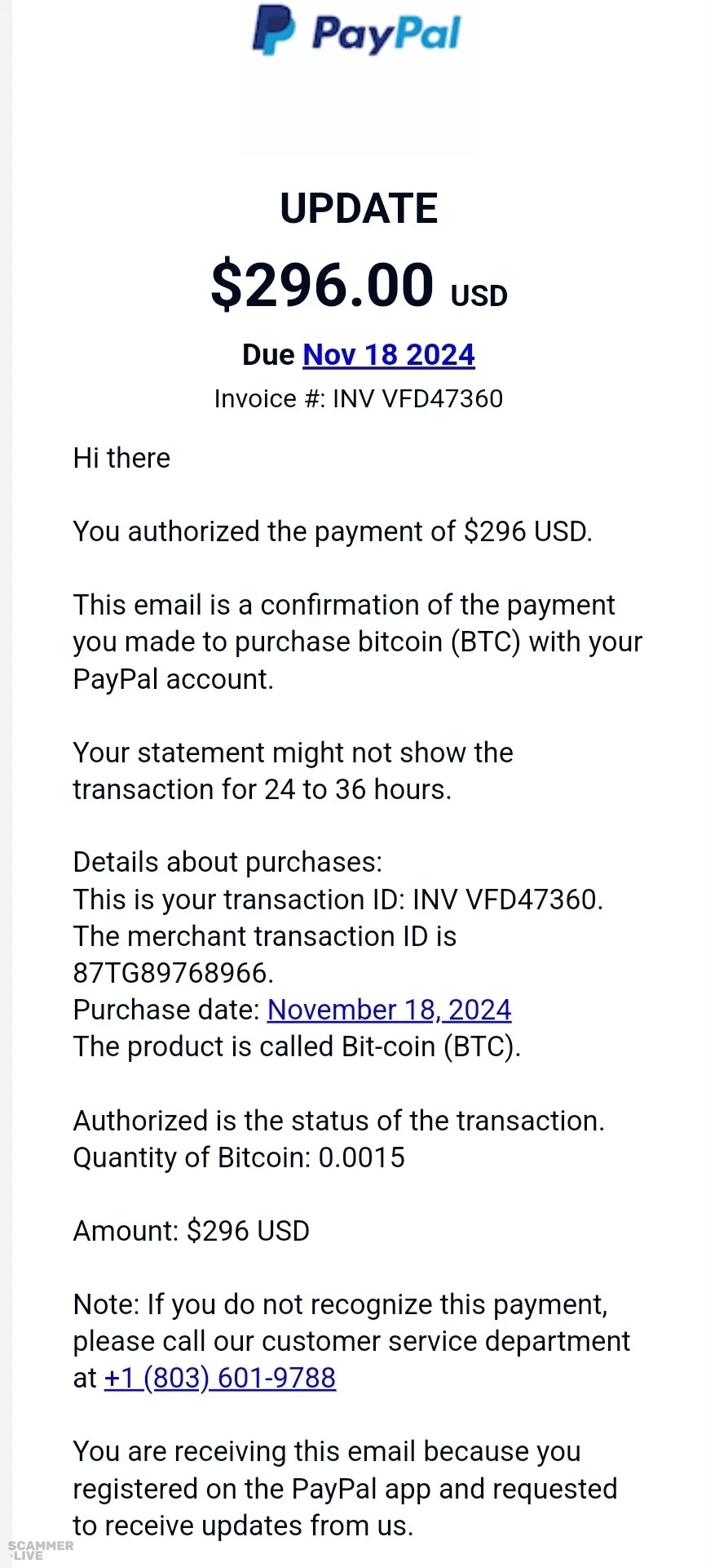 +1 (803) 601-9788 PayPal scam regarding a payment of $296 USD for a bitcoin purchase | UPDATE $296.00 Due Nov 18 2024 Invoice INV VFD47360 Hi there You authorized the payment of $296... | PayPal Scam |