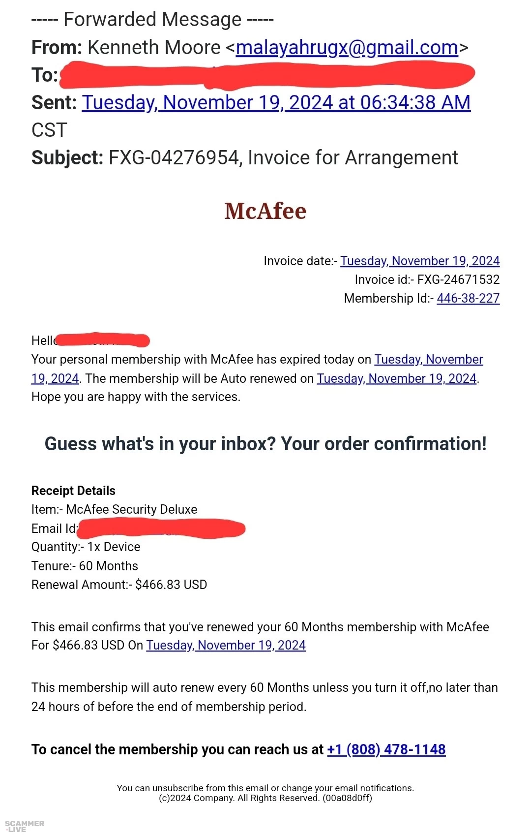 +1 (808) 478-1148, Kenneth Moore, malayahrugx@gmail.com, McAfee scam regarding Security Deluxe | Forwarded Message — From: Kenneth Moore malayahrugx@gmail.com To: Sent: Tuesday, November | 9, 2... | McAfee Scam |