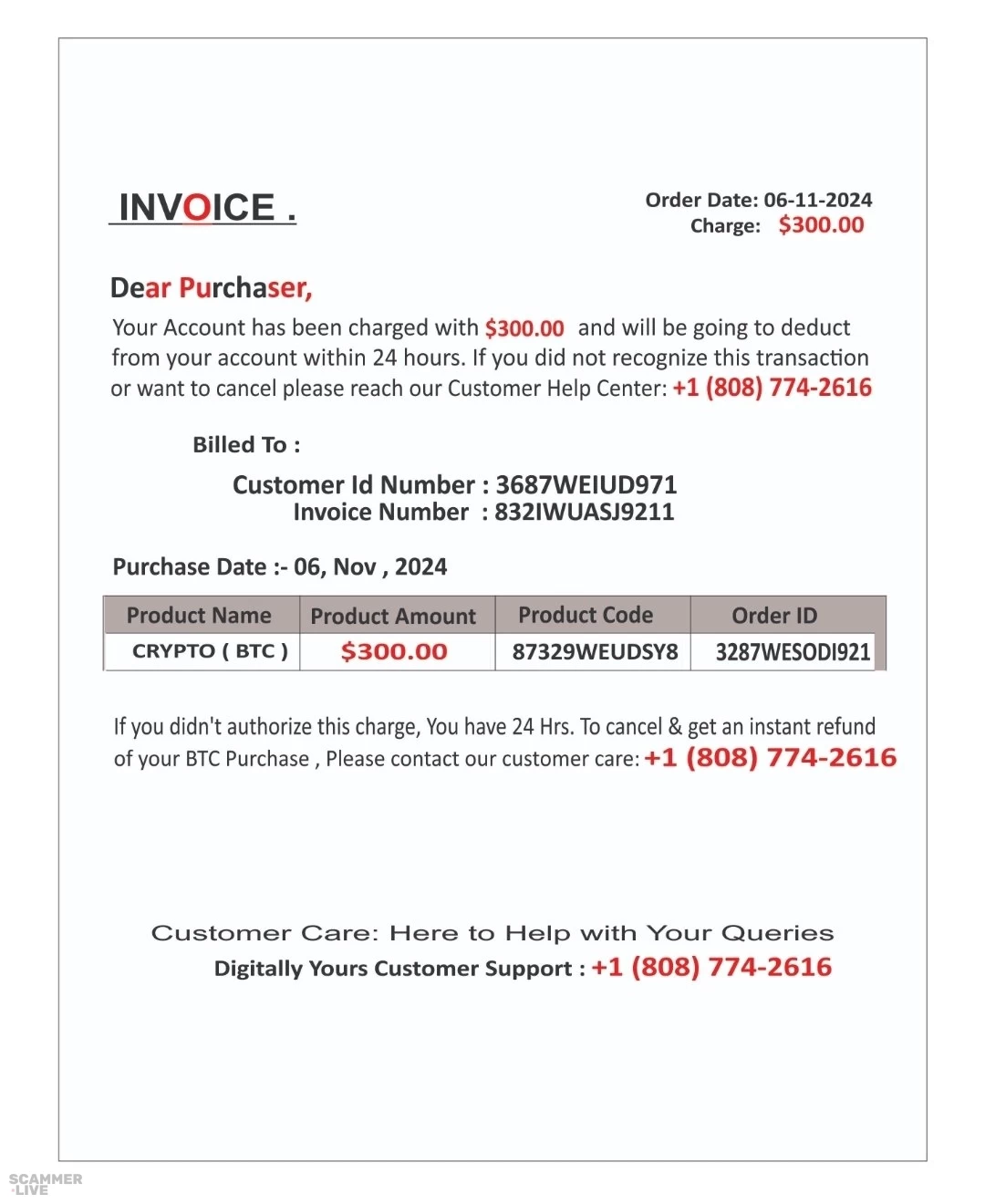 +1 (808) 774-2616 Crypto scammers invoice regarding BTC purchase | INVOICE . Dear Purchaser, Order Date: 06-11-2024 Charge: $300.00 Your Account has been charged w... | Crypto Scam |