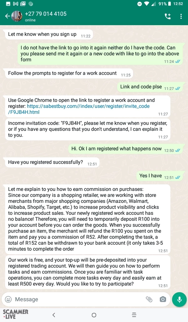SABESTBUY.COM | They offer employment. They give you a link and a code to register a work account. You register then... | Employment Scam |