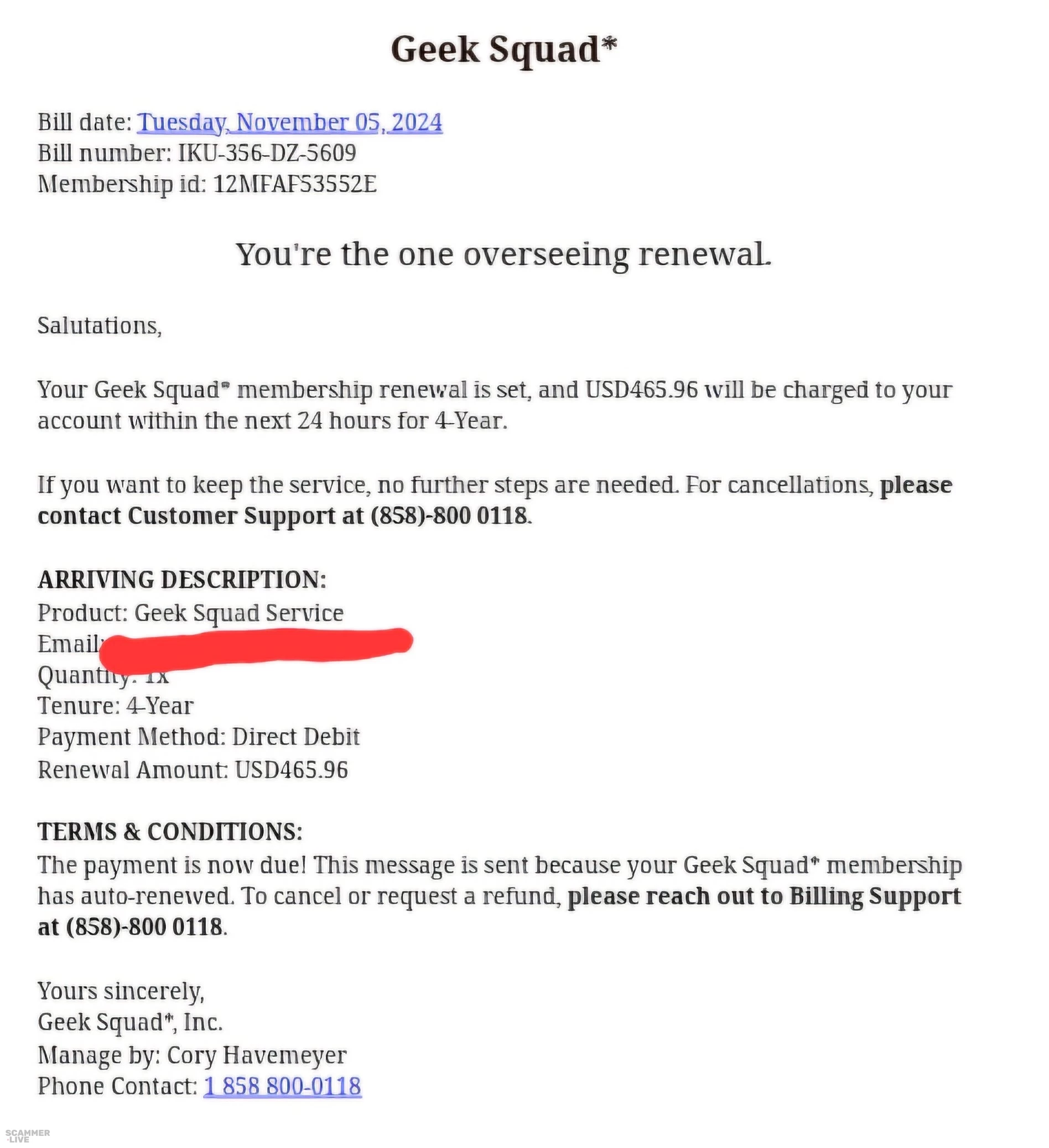 858 800-0118 Geek Squad scam regarding membership renewal | Bill date: Bill number: IKU-356-DZ-5609 Membership id: 12MFAF53552E You're the one overseeing ren... | Geek Squad Scam |