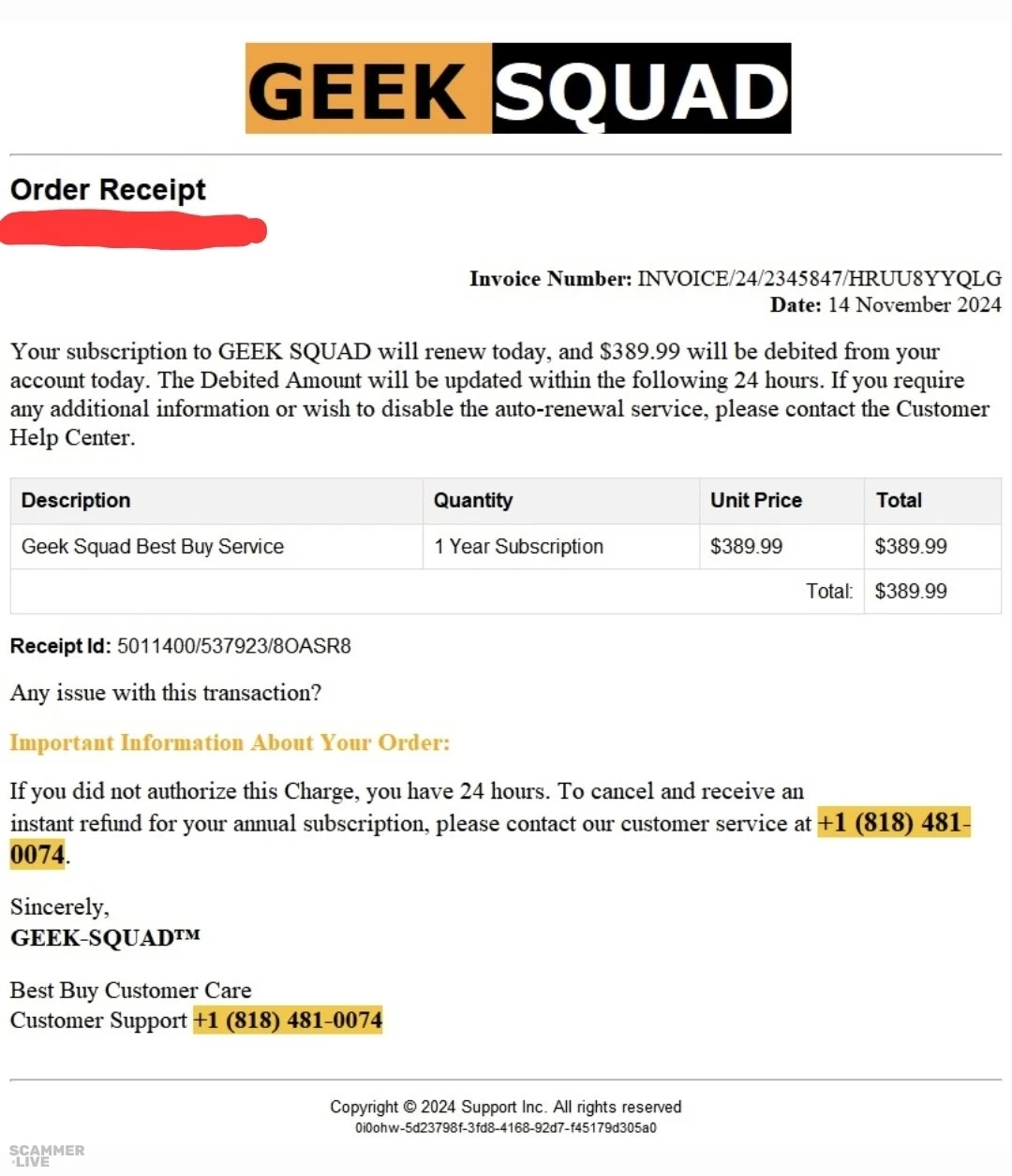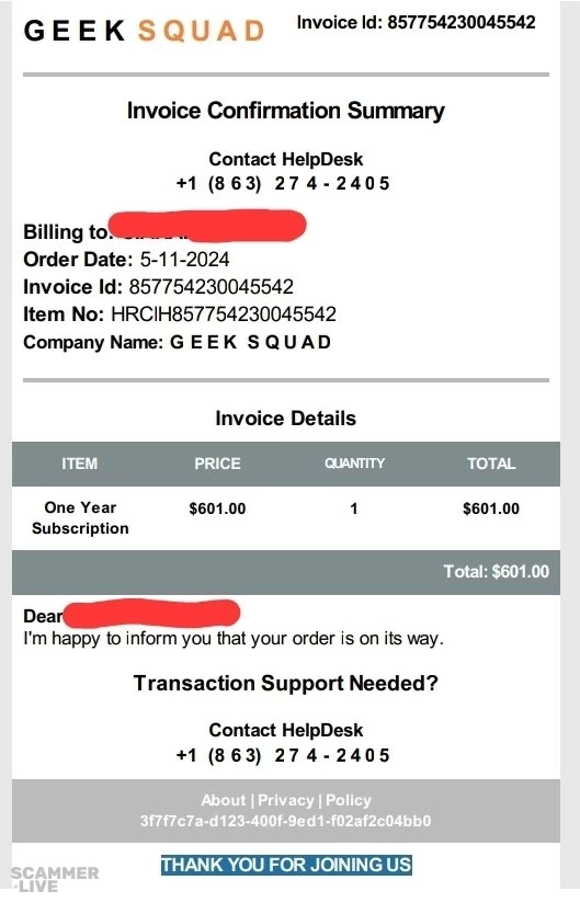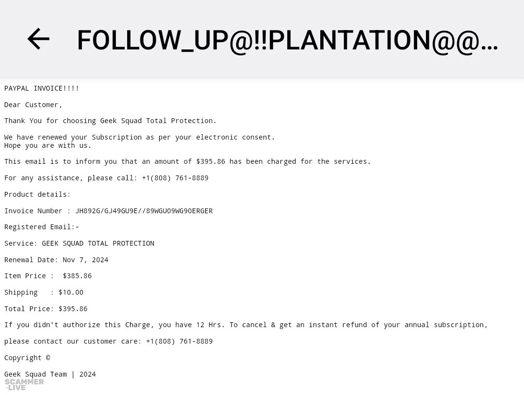 +1 (818) 481-0074 Geek Squad scam regarding 1 year subscription for Best Buy Services | Invoice Number: INVOICE/242345S47MRUUSYYQLG Date: 14 November 2024 Your subscription to GEEK SQUAD... | Geek Squad Scam |