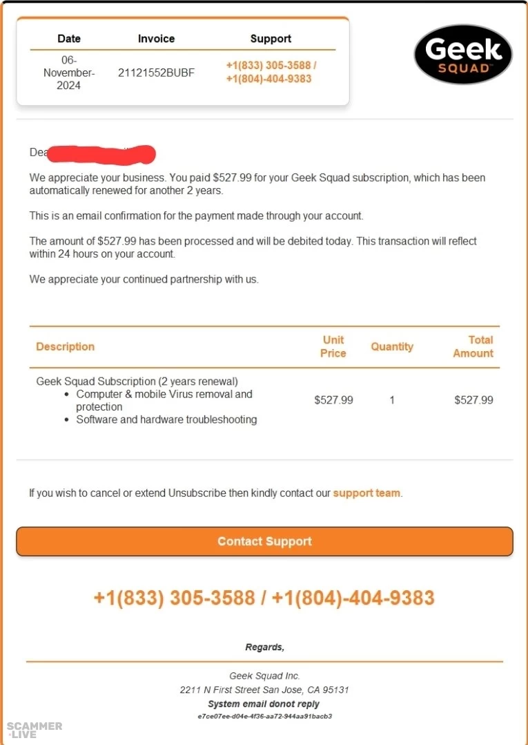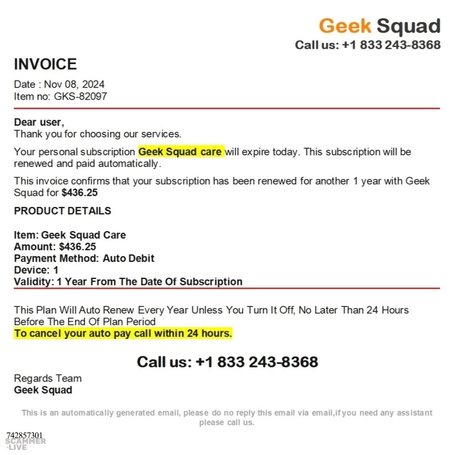 +1 833 243-8368 Geek Squad scam regarding squad care 1 year subscription renewal | Call us: +1 833 243-8368 INVOICE Date : Nov 08, 2024 Item no: GKS-82097 Dear user, Thank you fo... | Geek Squad Scam |