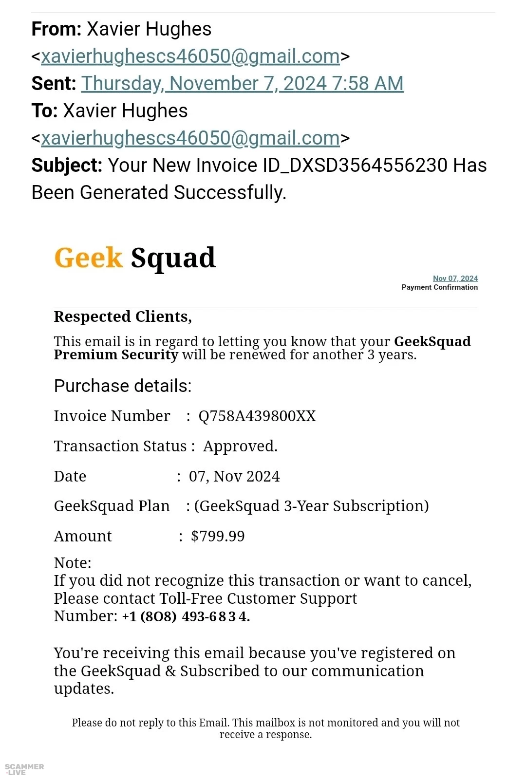 +1 (808) 493-6834, xavierhughescs46050@gmail.com, Xavier Hughes, Geek Squad scam | From: Xavier Hughes <xavierhughescs46050@gmail.com> Thursday, November 7, 2024 7:58 AM Sent: To:... | Geek Squad Scam |