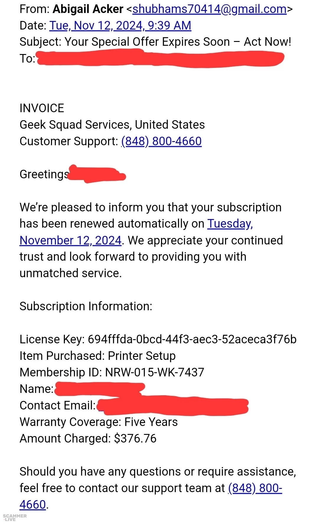 (848) 800- 4660 Geek Squad scam regarding services / renewal | From: Abigail Acker <shubhams70414@gmail.com> Date: Tue, Nov 12, 2024, 9:39 AM Subject: Your Speci... | Geek Squad Scam |