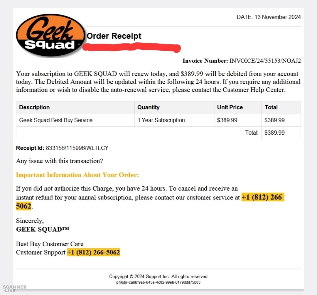 +1 (812) 266-5062 Geek Squad scam regarding 1 year subscription of Best Buy Services | DATE: 13 November 2024 Order Receipt Squad Invoice Number: INVOICE/24/55153/NOAJ2 Your subscript... | Geek Squad Scam |