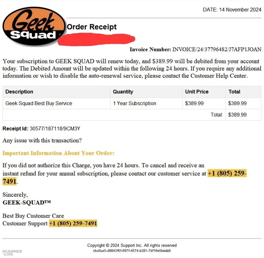 +1 (805) 259-7491 Geek Squad scam regarding 1 year subscription of Best Buy Services | DATE: 14 November 2024 Order Receipt Squad Invoice Number: INVOICE/24/37796482/J7AFPIJOAN Your s... | Geek Squad Scam |