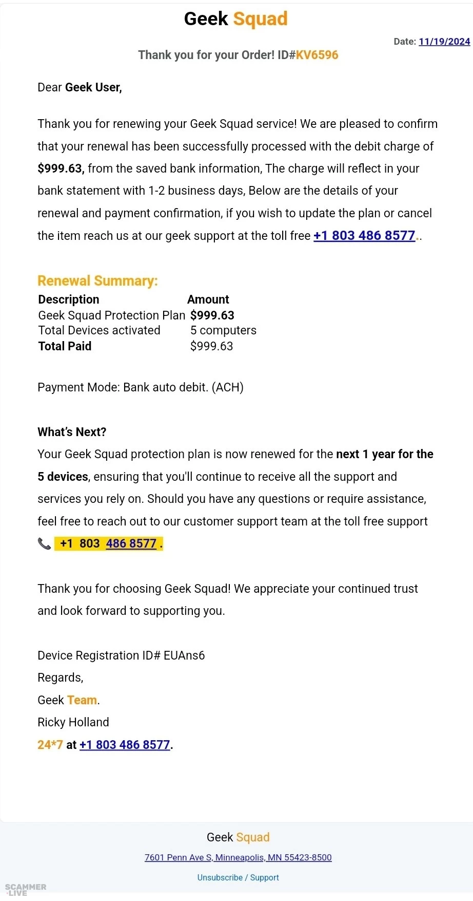 +1 803 486 8577 Geek Squad scam regarding Protection Plan for 5 computers | Geek Squad Date: 11/19/2024 Thank you for your Order! ID#KV6596 Dear Geek User, Thank you for re... | Geek Squad Scam |