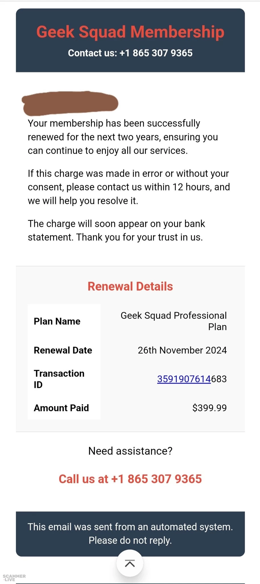+1 865 307 9365 Geek Squad renewal scam regarding Professional Plan for $399.99 USD | Geek Squad Membership Contact us: +1 865 307 9365 Your membership has been successfully renewed f... | Geek Squad Scam |