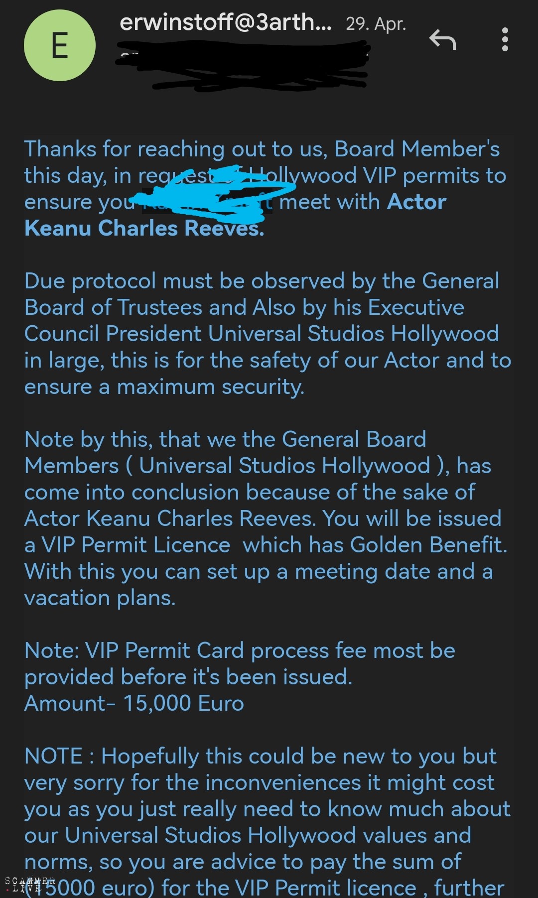 Erwinstoff@3arthollywood.com | Fan card, meet in person with Keanu Reeves | Gmail Scam |