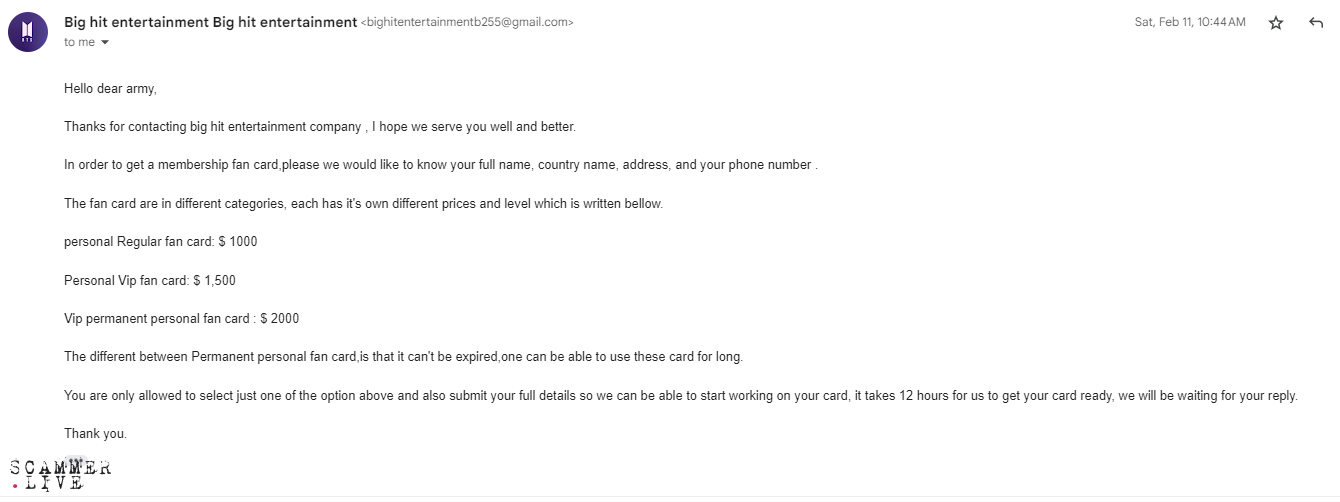 bighitentertainmentb255@gmail.com | Celebrity scam, pretending to be from Big Hit Entertainment / Jeon Jungkook | Gmail Scam |