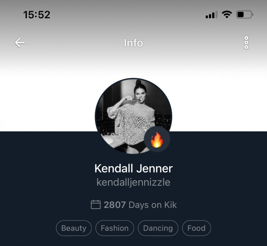 kendalljennizzle | Impersonating Kendall Jenner on Kik. Asking for explicit pictures and videos. Have in mind, the real... | Kik Scam |