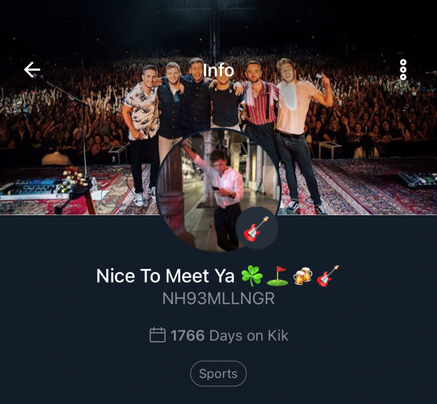 NH93MLLNGR | Impersonating Niall Horan on Kik. Asking for explicit pictures and videos. Have in mind, the real Ni... | Kik Scam |