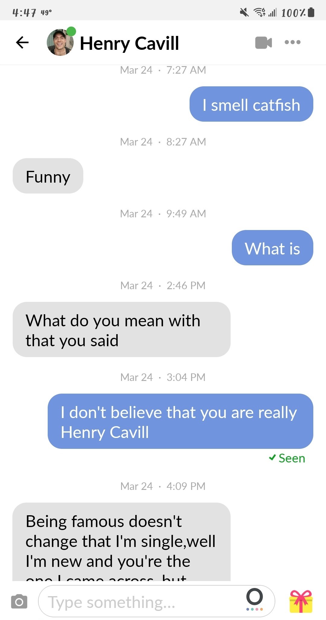 henrycvllondon22@gmail.com | Pretending to be Henry Cavill. He basically wrote me. He said i was cute. I called him a catfish. Hi... | MeetMe Scam |