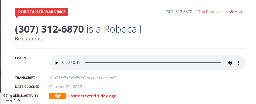 (307) 312-6870 | Robocall | Pharmacy Scam |