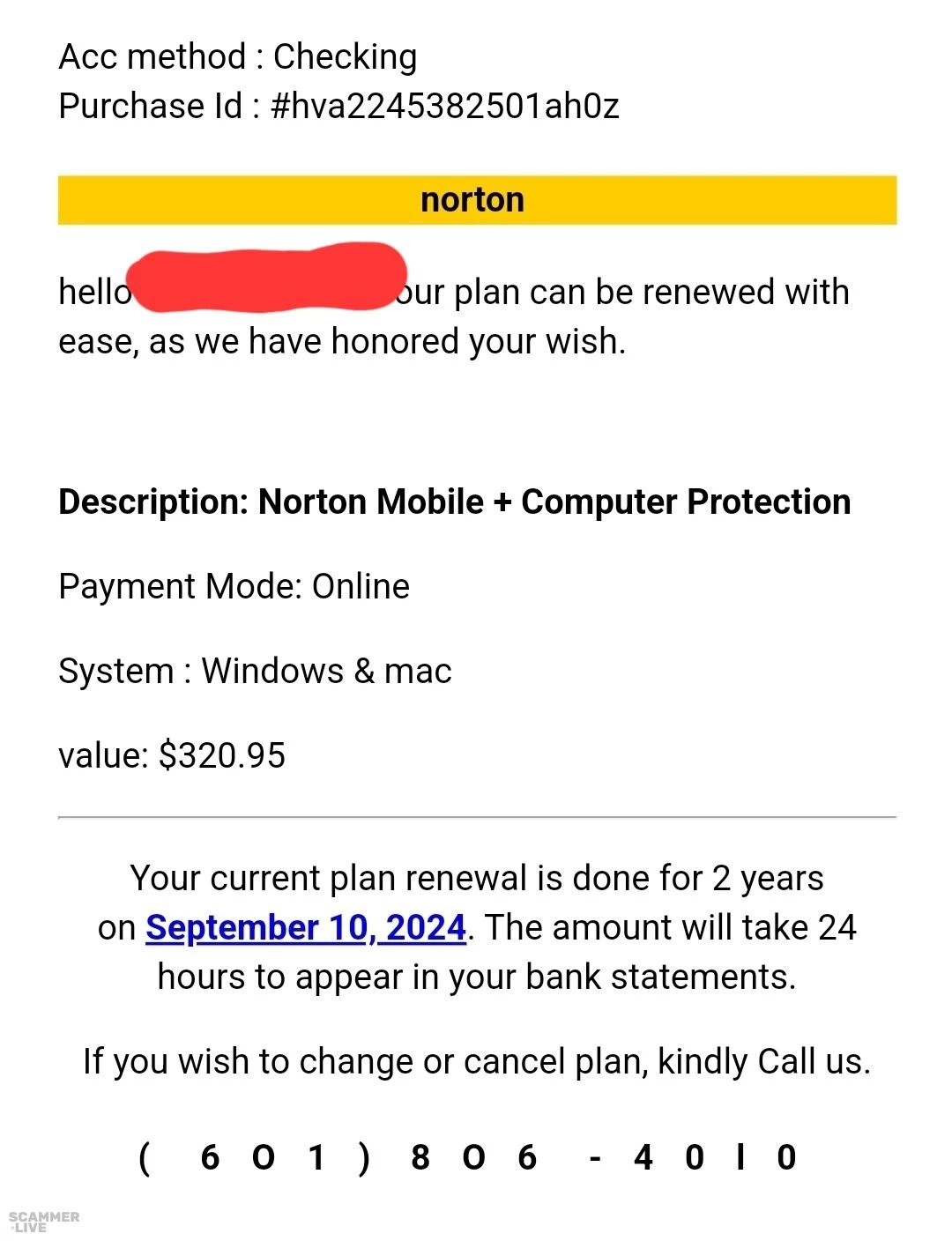 Acc method : Checking Purchase ld : #hva2245382501 ahOz hell norton ur plan can be renewed with ease, as we have honored your wish. Description: Norton Mobile + Computer Protection Payment Mode: Online System : Windows & mac value: $320.95 Your current plan renewal is done for 2 years on September 10, 2024. The amount will take 24 hours to appear in your bank statements. If you wish to change or cancel plan, kindly Call us. +1 (601) 806-4010