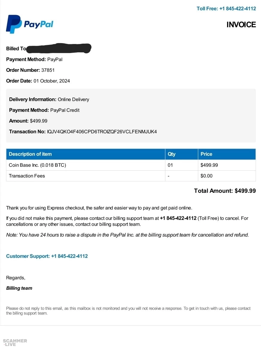 PayPal Billed T Payment Method: PayPal Nurnber: 37851 a-der Date: 01 October, 2024 Delivery Information: Online Delivery Payment Method: PayPal Credit Amount: $499.99 Transaction No: IQJV4QK04F406CPD6TROZQF26VCLFENMJUK4 Description of item Coin Base hc. (0.018 BTC) Transaction Fees 01 Toll Free: +1 8454224112 INVOCE Price $499.99 $0.00 Total Amount: $499.99 you for using Express checkout, the safer aryi easier way to pay aryl get paid online. tf you did mt make this payment, please contact our billing stQport team at +1 8454224112 (Toll Free) to cancel. For cancellations or any other issues, contact our billing support team. Note: You have 24 hours to raise a dispute in the PayPal Inc. at the billing support team for cancellation and refund. Customer Support: +1 8454224112 Regards, Billing team Please rd to ttis emäl, as this rnailbox is rrmitcred WII ru a response. To get in touch Wth us, please cortact team.