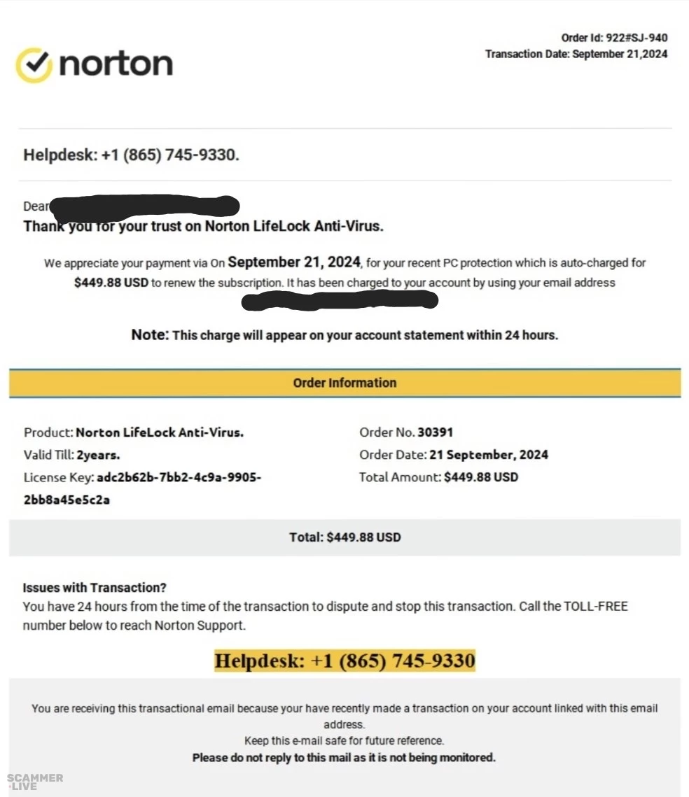 ld: 922#SJ-940 Trmsaction Septenb« 21 *024 norton Helpdesk: +1 (865) 745-9330. Dea Than y r your trust on Norton LifeLock Anti-Virus. We appreciate your payment via On September 21 , 2024, your recent PC protection which is auWcharged for $449.88 USD to renew the subscription It has been charqed to your account by using you email address Note: This charge will appear on your account statement within 24 hours. Product: Norton LifeLock Anti-Virus. Valid Till: 2years. License Key: adc2b62b-7bb2-4c9a-9905- 2bb8a45eSc2a Issues with Transaction? Order Information Order No. 30391 Order Date: 21 September, 2024 Total Amount: $449.88 USD Total: $449.88 USD You have 24 hours from the time of the transaction to dispute and stop this transaction. Call the TOLL-FREE number below to reach Norton Support. Helpdesk: +1 (865) 745-9330