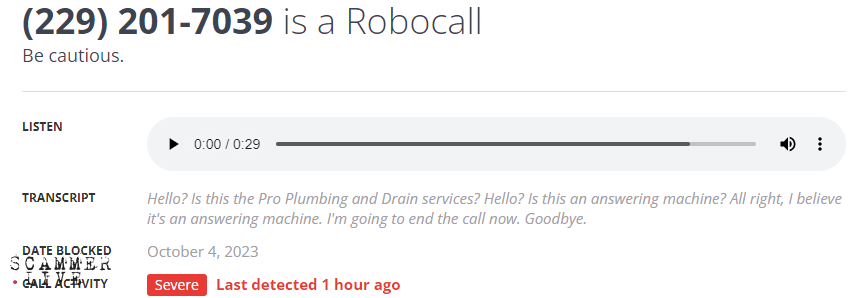 Hello? Is this the Pro Plumbing and Drain services? Hello? Is this an answering machine? All right, I believe it's an answering machine. I'm going to end the call now. Goodbye.