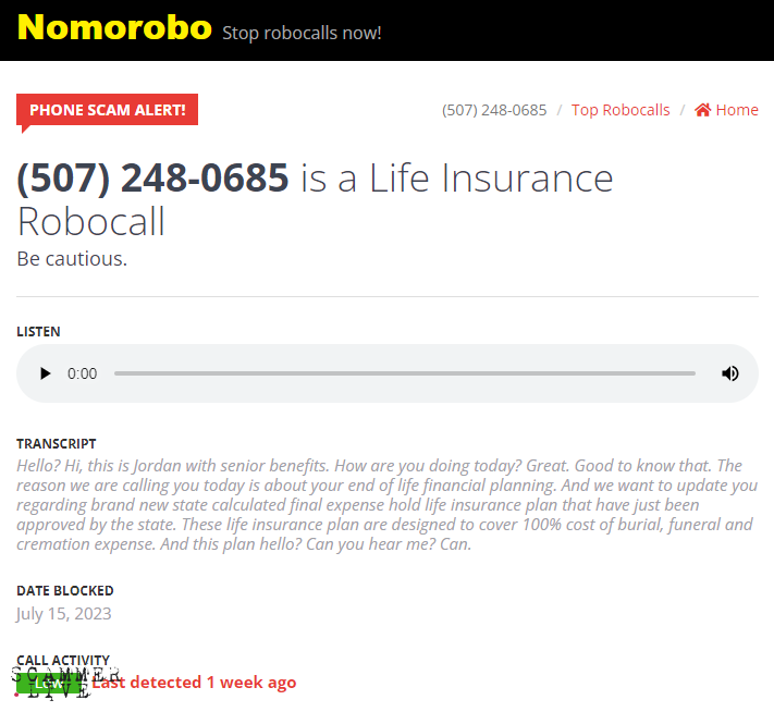Hello? Hi, this is Jordan with senior benefits. How are you doing today? Great. Good to know that. The reason we are calling you today is about your end of life financial planning. And we want to update you regarding brand new state calculated final expense hold life insurance plan that have just been approved by the state. These life insurance plan are designed to cover 100% cost of burial, funeral and cremation expense. And this plan hello? Can you hear me? Can.