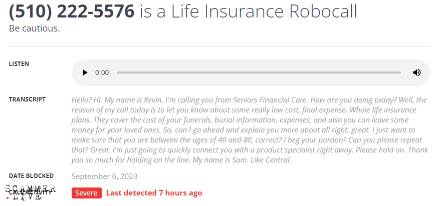 Hello? Hi. My name is Kevin. I'm calling you from Seniors Financial Care. How are you doing today? Well, the reason of my call today is to let you know about some really low cost, final expense. Whole life insurance plans. They cover the cost of your funerals, burial information, expenses, and also you can leave some money for your loved ones. So, can I go ahead and explain you more about all right, great. I just want to make sure that you are between the ages of 40 and 80, correct? I beg your pardon? Can you please repeat that? Great. I'm just going to quickly connect you with a product specialist right away. Please hold on. Thank you so much for holding on the line. My name is Sam. Like Central.
