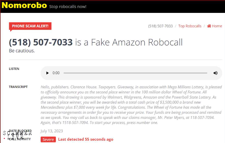 Hello, Publishers Clearing House. Taxpayers. Giveaway, in association with Mega Millions Lottery, is pleased to officially announce you as the second place winner in the 100 million dollar Wheel of Fortune. All giveaway. This drawing is sponsored by Walmart, Walgreens, Amazon and the Powerball State Lottery. As the second place winner, you will be awarded with a total cash prize of $3,500,000 a brand new MercedesBenz plus $7,000 every week for life. Congratulations. The Wheel of Fortune has made all the necessary arrangements in order for you to receive your prize. Your funds are being processed and remitted as we speak. You may call us back to speak with our claims manager, Mr. Peter Myers, at 118-507-7094. Again, that’s 1518-507-7094. To start your process, press number one.