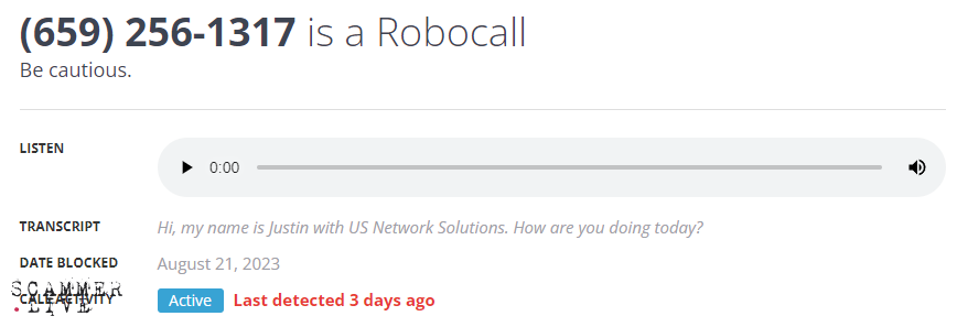 robocaller Justin again with US Network Solutions, different number lol
