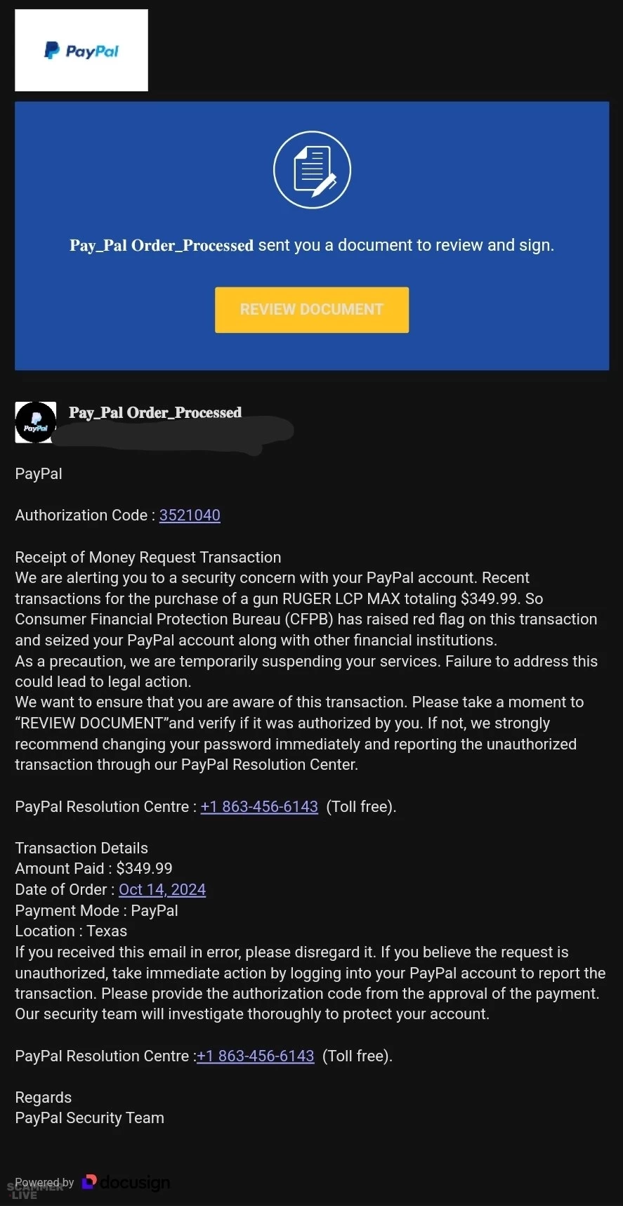 PayPal Authorization Code : 3521040 Receipt of Money Request Transaction We are alerting you to a security concern with your PayPal account. Recent transactions for the purchase of a gun RUGER LCP MAX totaling $349.99. So Consumer Financial Protection Bureau (CFPB) has raised red flag on this transaction and seized your PayPal account along with other financial institutions. As a precaution, we are temporarily suspending your services, Failure to address this could lead to legal action. We want to ensure that you are aware of this transaction. Please take a moment to "REVIEW DOCUMENT"and verify if it was authorized by you. If not, we strongly recommend changing your password immediately and reporting the unauthorized transaction through our PayPal Resolution Center. PayPal Resolution Centre : +1 863-456-6143 (Toll free). Transaction Details Amount Paid : $349.99 Date of Order : Oct 14, 2024 Payment Mode : PayPal Location : Texas If you received this email in error, please disregard it. If you believe the request is unauthorized, take immediate action by logging into your PayPal account to report the transaction. Please provide the authorization code from the approval of the payment. Our security team will investigate thoroughly to protect your account. PayPal Resolution Centre 863-456-6143 (Toll free). Regards PayPal Security Team