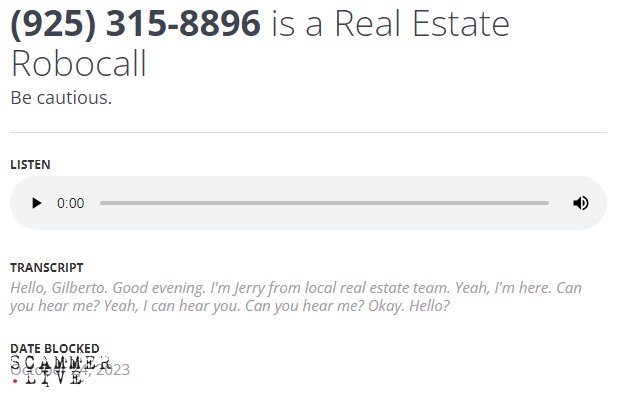 Scam/Fraud Info:Hello, Gilberto. Good evening. I'm Jerry from local real estate team. Yeah, I'm here. Can you hear me? Yeah, I can hear you. Can you hear me? Okay. Hello?
