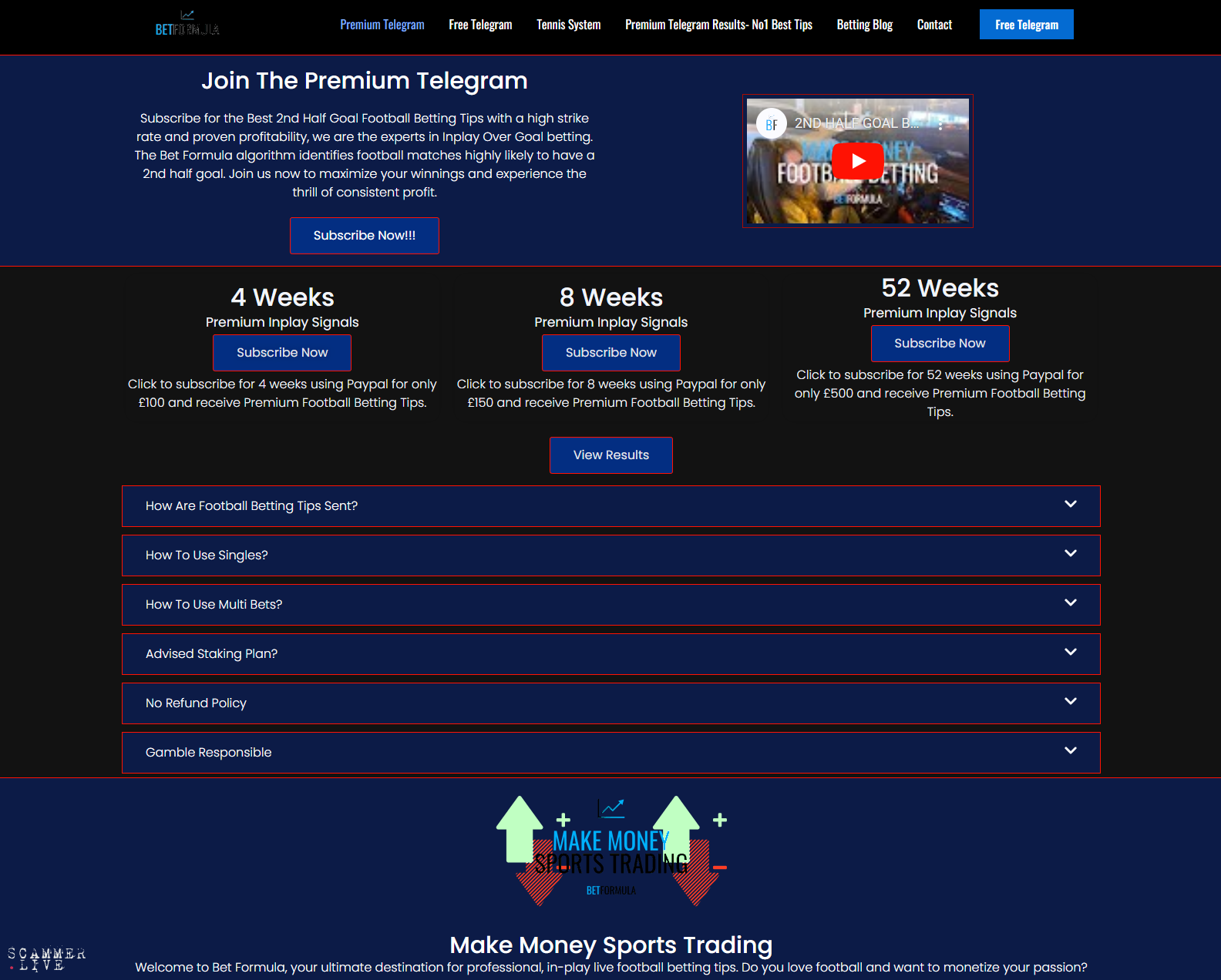 Scam/Fraud Info:Shows a winning betting tip, hides his losses, tells people on youtube videos that every bet wins, promotes a VIP telegram channel which people pay £100 a month to join, when the reality hits that his tips actual lose, he blocks people, keeps the £100. He filters comments on his youtube so only good ones he posts and on his telegram he has it set to read only so people cant reply to warn others