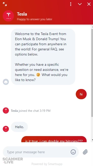 Scam/Fraud Info:These scammers hacked YouTube channels, changed their names to things like "Tesla," and started live scam streams. Their latest scam stream is called "Elon Musk & Donald Trump Live Interview."