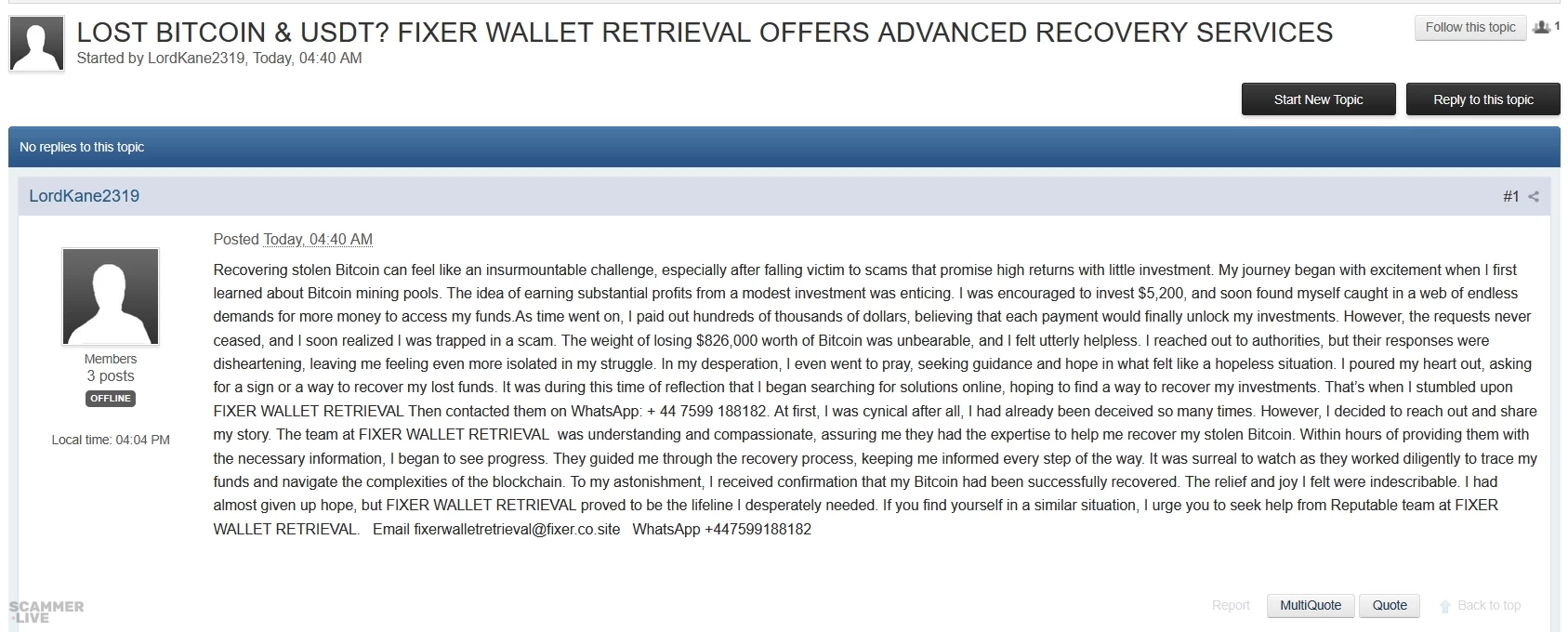 Scam/Fraud Info:Recovering stolen Bitcoin can feel like an insurmountable challenge, especially after falling victim to scams that promise high returns with little investment. My journey began with excitement when I first learned about Bitcoin mining pools. The idea of earning substantial profits from a modest investment was enticing. I was encouraged to invest $5,200, and soon found myself caught in a web of endless demands for more money to access my funds.As time went on, I paid out hundreds of thousands of dollars, believing that each payment would finally unlock my investments. However, the requests never ceased, and I soon realized I was trapped in a scam. The weight of losing $826,000 worth of Bitcoin was unbearable, and I felt utterly helpless. I reached out to authorities, but their responses were disheartening, leaving me feeling even more isolated in my struggle. In my desperation, I even went to pray, seeking guidance and hope in what felt like a hopeless situation. I poured my heart out, asking for a sign or a way to recover my lost funds. It was during this time of reflection that I began searching for solutions online, hoping to find a way to recover my investments. That’s when I stumbled upon FIXER WALLET RETRIEVAL Then contacted them on WhatsApp: + 44 7599 188182. At first, I was cynical after all, I had already been deceived so many times. However, I decided to reach out and share my story. The team at FIXER WALLET RETRIEVAL was understanding and compassionate, assuring me they had the expertise to help me recover my stolen Bitcoin. Within hours of providing them with the necessary information, I began to see progress. They guided me through the recovery process, keeping me informed every step of the way. It was surreal to watch as they worked diligently to trace my funds and navigate the complexities of the blockchain. To my astonishment, I received confirmation that my Bitcoin had been successfully recovered. The relief and joy I felt were indescribable. I had almost given up hope, but FIXER WALLET RETRIEVAL proved to be the lifeline I desperately needed. If you find yourself in a similar situation, I urge you to seek help from Reputable team at FIXER WALLET RETRIEVAL. Email fixerwalletretrieval@fixer.co.site WhatsApp +447599188182