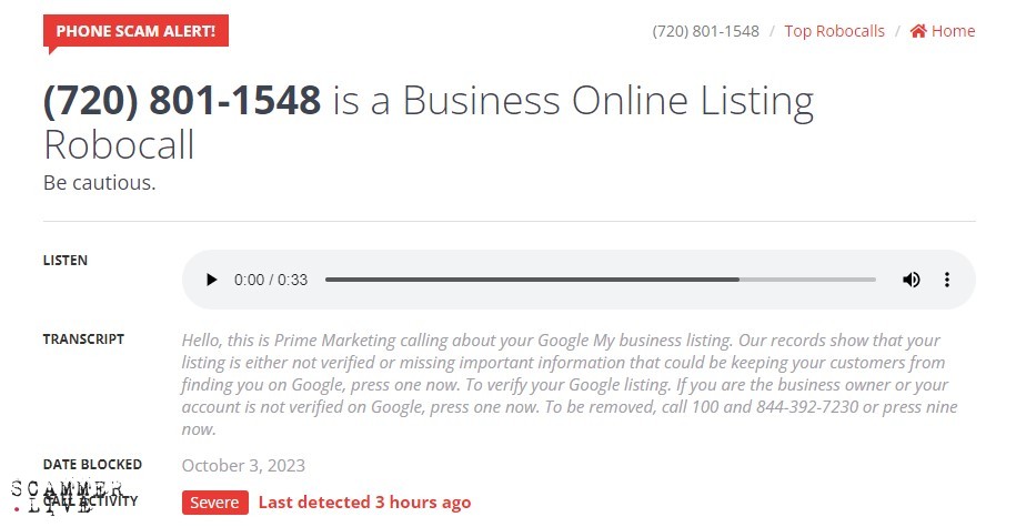 Robocall: Prime Marketing calling about Google "My Business"...