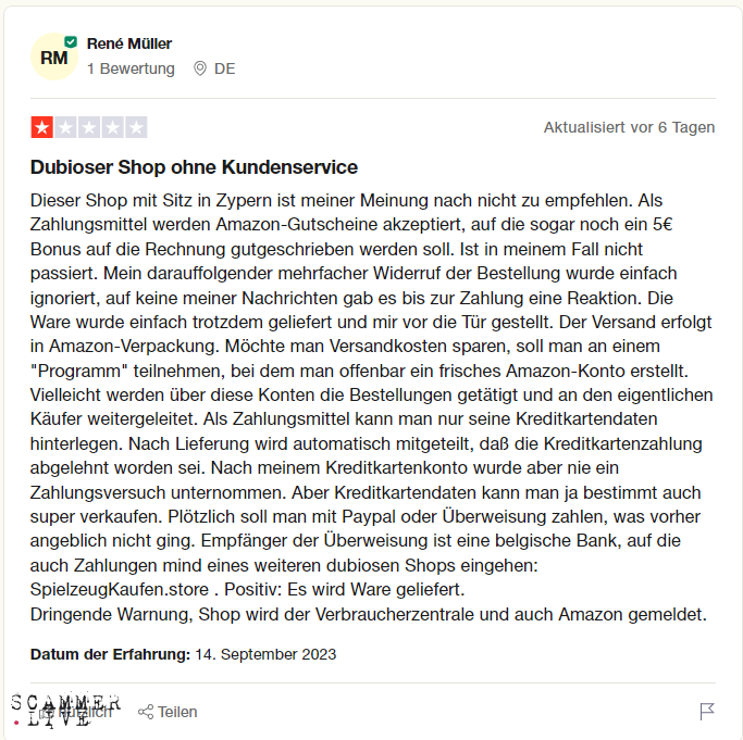 Scam/Fraud Info:Ich schreibe dieses review weil ich glaube das alle positiven bewertungen auf trustpilot fake sind, denn dort sind auch viele negative bewertungen die all die positiven nicht bestätigen. Anscheinend kaufen die es bei amazon ein und verschicken es dann nach Deutschland, aber sitzen selber in Zypern. Die wollen auch Amazon Geschenkgutscheine beim bezahlen haben und dafür bekommt man dann einen Rabatt, aber es gab Bewertungen wo gesagt wurde das die den Amazon Gutschein eingelöst haben aber selber nichts erhalten hat.