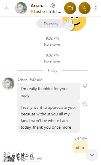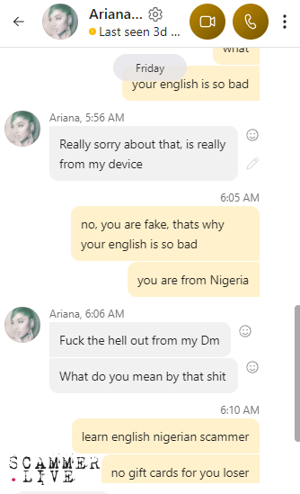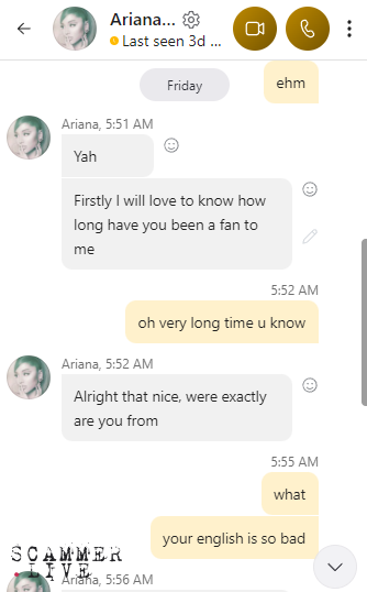 Scam/Fraud Info:Fake Ariana Grande on Skype, he is from Nigeria trying to steal money from fans. His english is very bad.