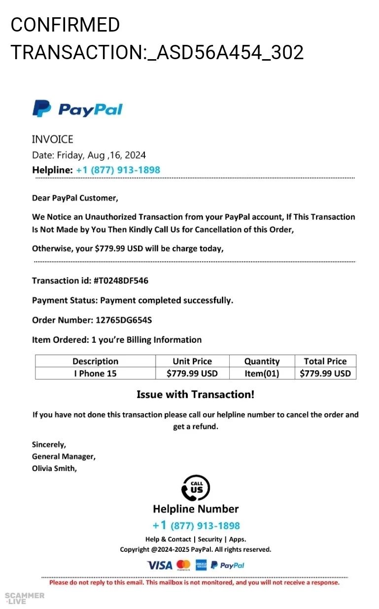 CONFIRMED payPa1 INVOICE Date: Friday, Aug , 16, 2024 Helpline: +1 (877) 913-1898 Dear PayPal Customer, We Notice an Unauthorized Transaction from your PayPal account, If This Transaction Is Not Made by You Then Kindly Call Us for Cancellation of this Order, Otherwise, your $779.99 USD will be charge today, Transaction id: #T0248DF546 Payment Status: Payment completed successfully. Order Number: 12765DG654S Item Ordered: 1 you're Billing Information Description I Phone 15 Unit Price $779.99 USD Quantity Item(01) Total Price $779.99 USD Issue with Transaction! If you have not done this transaction please call our helpline number to cancel the order and get a refund. Sincerely, General Manager, Olivia Smith, CALL us Helpline Number +1 (877) 913-1898